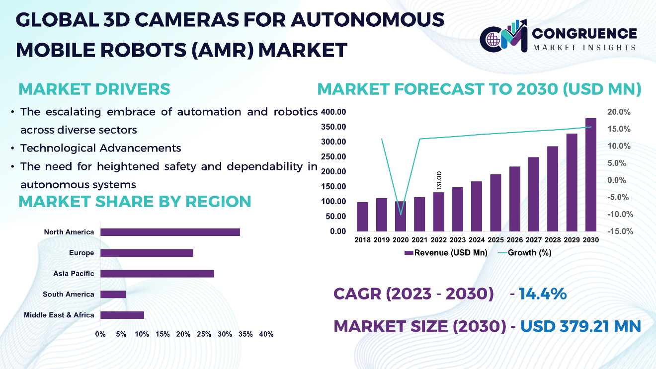The Global 3D Cameras for Autonomous Mobile Robots (AMR) Market was valued at USD 131 Million in 2022 and is anticipated to reach a value of USD 379.2 Million by 2030 expanding at a CAGR of 14.4% between 2023 and 2030.