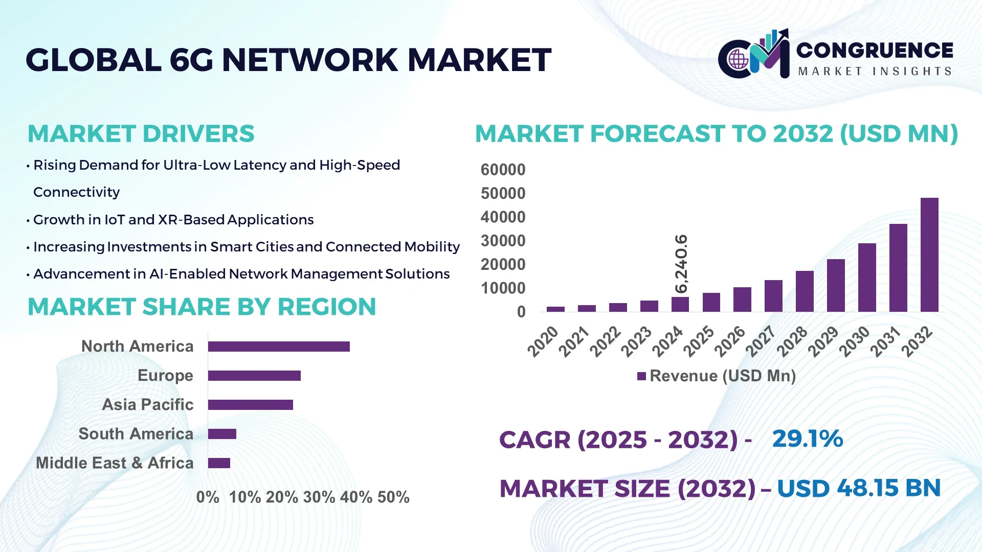 The Global 6G Network Market was valued at USD 6,240.6 Million in 2024 and is anticipated to reach a value of USD 48,154.4 Million by 2032 expanding at a CAGR of 29.1% between 2025 and 2032. This uptick is fueled by surging demand for ultra-low latency connectivity and AI-driven network optimization.
