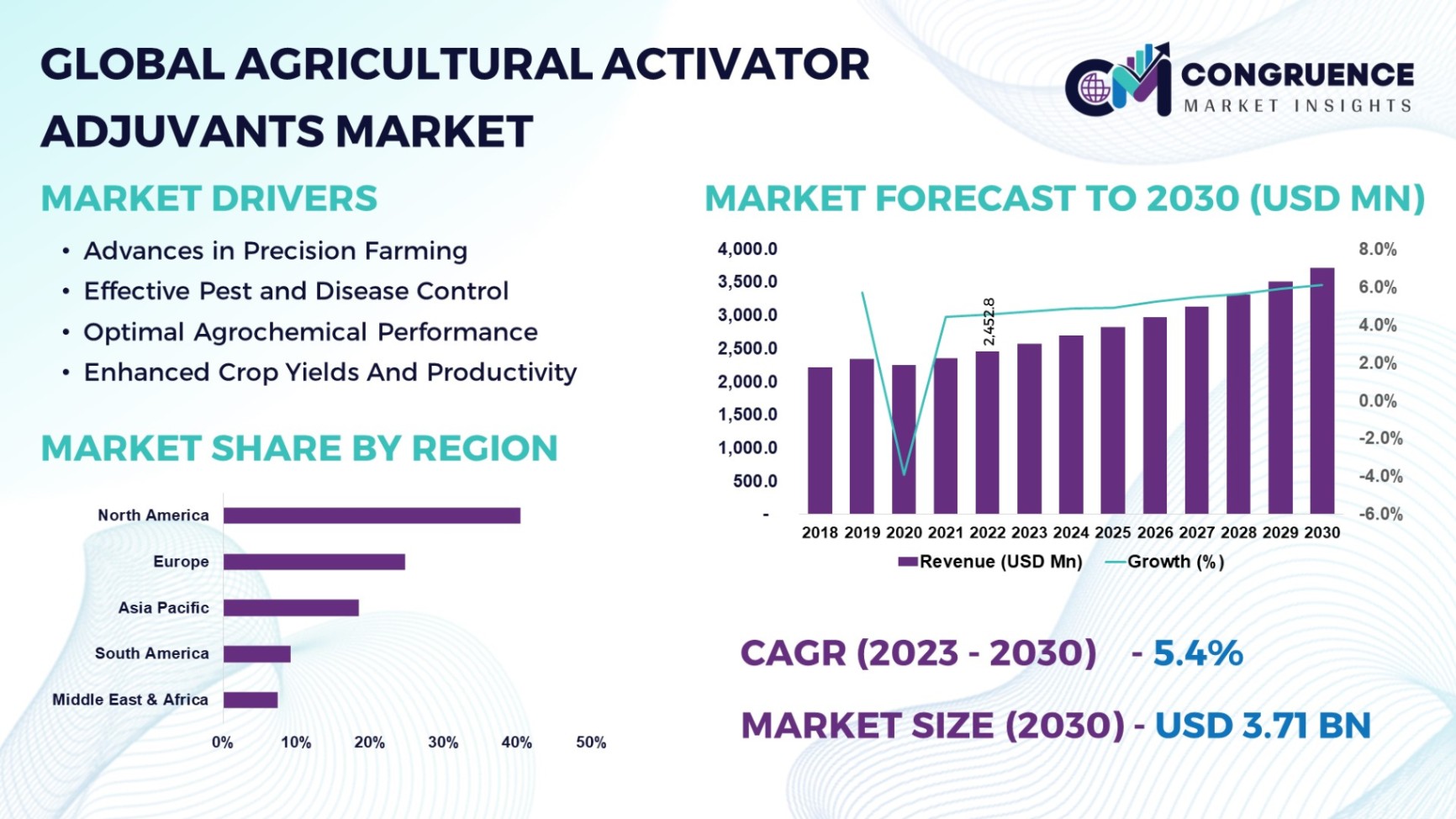 The global agricultural activator adjuvants market was valued at USD 2,452.8 Million in 2022 and is anticipated to reach a value of USD 3,717.5 Million by 2030 expanding at a CAGR of 5.4% between 2023 and 2030.