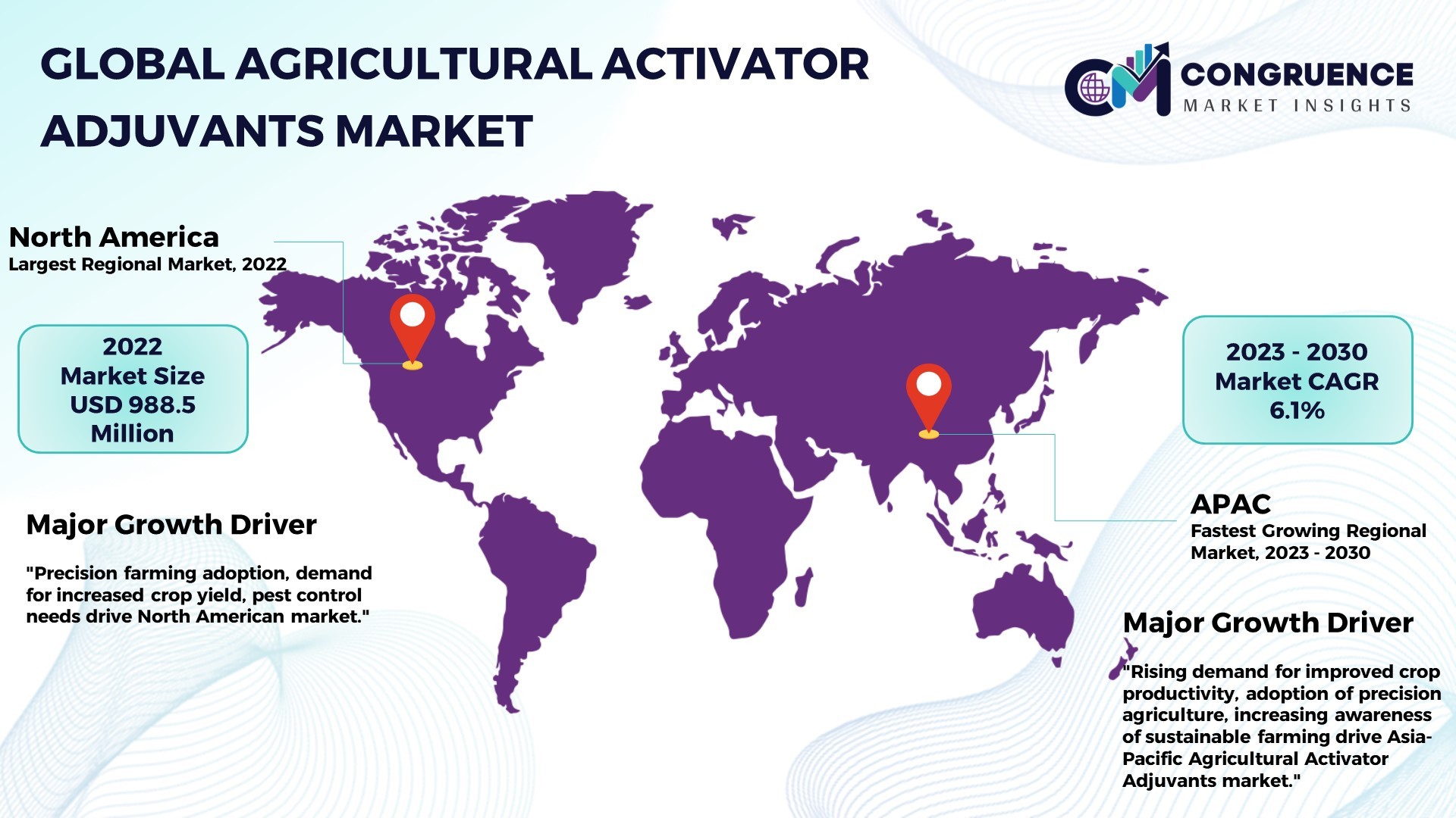 In North America, The United States and Canada are the twomain competitors in the agricultural activator adjuvant market. The robustfarming industry in the area, which depends on cutting-edge agrochemicalsand technology, drives the market. The usage of adjuvants to reduce theecological effects of agrochemicals has been impacted by environmentalrestrictions and an emphasis on environmentally friendly farming methods. InAsia-Pacific, the requirement for agricultural output in the region is beingdriven by its vast and expanding population. The fast-paced economicexpansion in the area is raising disposable incomes and driving up appetitesfor better-quality meals. Increasing adherence to contemporary farming methodsthat need adjuvants, including precision agriculture. The region's growing pestand disease predominance is pushing up the requirement for more potentpesticides. In Europe, agricultural adjuvants have developed marketplaces in thenations such as Germany, France, and the UK. Adjuvant uptake in the area hasbeen prompted by strict laws regulating the use of agrochemicals andsafeguarding the environment. An increasing tendency for organic andsustainable farming has an impact on the market as well.