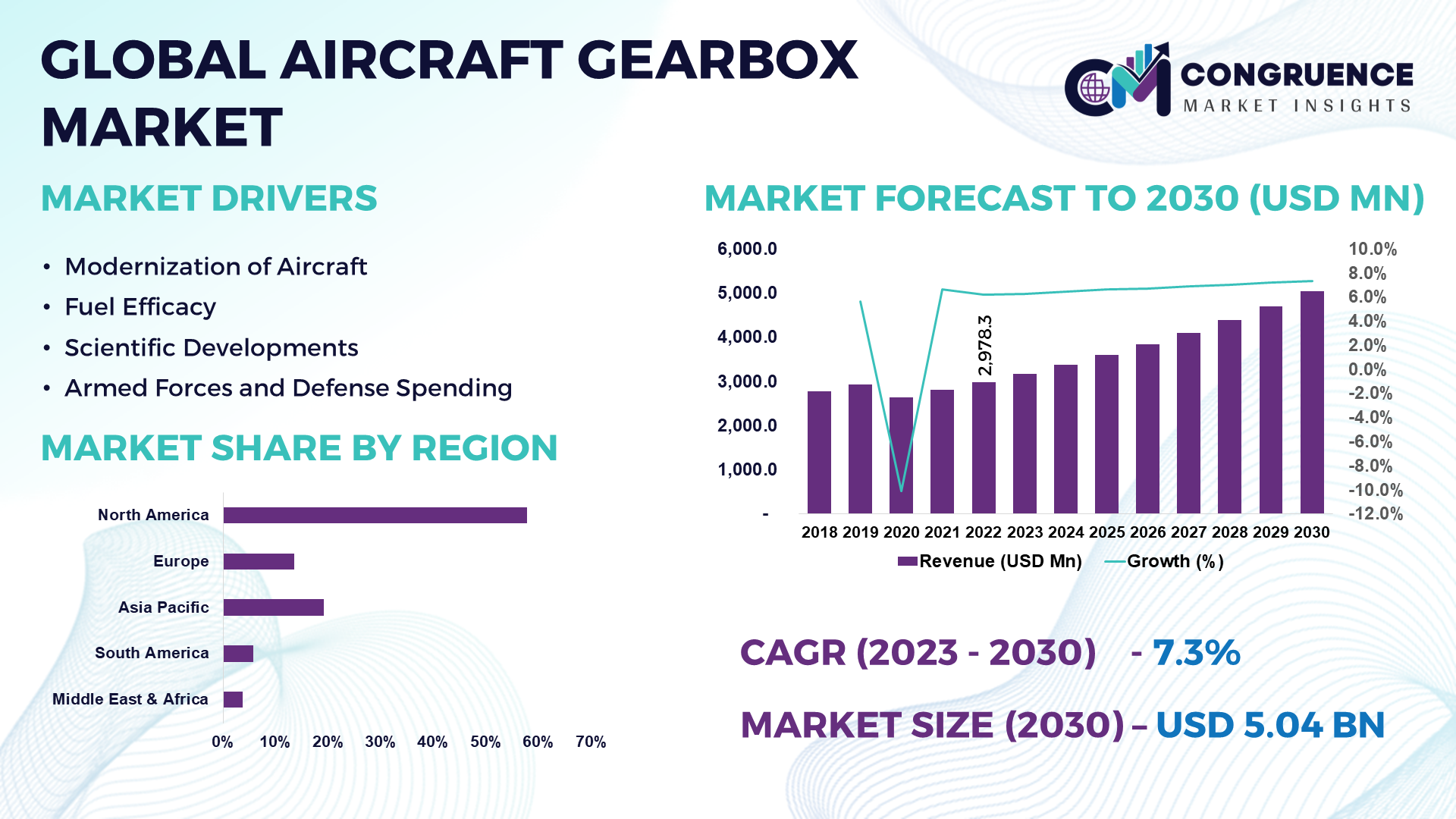 The global aircraft gearbox market was valued at USD 2,978.3 Million in 2022 and is anticipated to reach a value of USD 5,041.1 Million by 2030 expanding at a CAGR of 6.9% between 2023 and 2030.