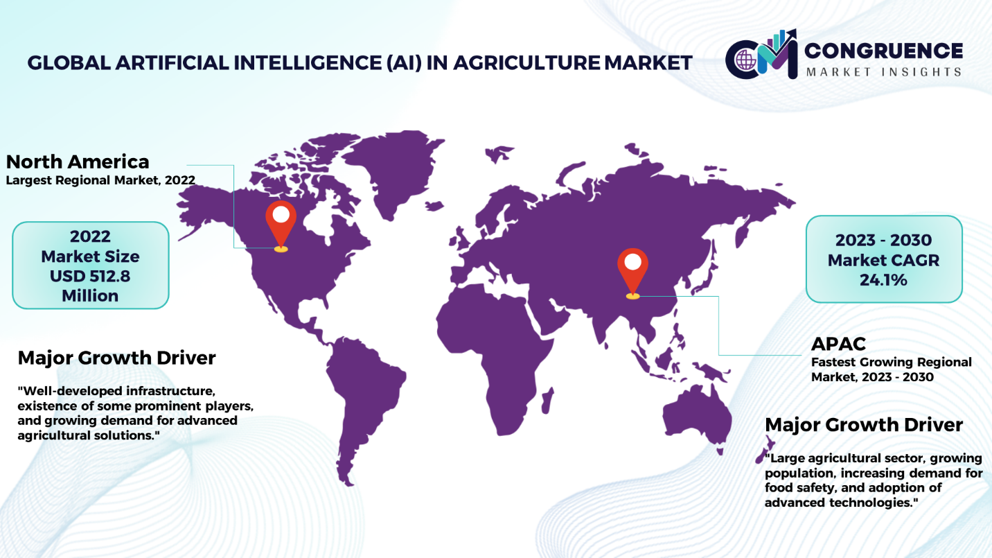 In North America, the demand is driven by well-developed infrastructure, existence of some prominent players, and growing demand for advanced agricultural solutions in the region. Additionally, the North American market for AI in agriculture has been witnessing significant growth due to increasing adoption of AI technologies in the agriculture industry, rising demand for precision farming techniques, and need for increased productivity. In Europe, the market growth is attributed to the growing interest in the applications of artificial intelligence in the agriculture sector. Europe emphasizes on sustainable practices to reduce environmental impact driven by environmental concerns. In Asia-Pacific, the market is characterized by large agricultural sector, growing population, increasing demand for food safety, and adoption of advanced technologies in the region. Furthermore, the growth can be attributed to the government initiatives and support for the adoption of AI technology, and high adoption of AI in agricultural sector by major countries such as China, India, South Korea, and Japan. The Middle East and Africa has been witnessing a growing demand for AI in agriculture industry due to growing government initiatives to modernize agriculture and rising climate challenges in the region.