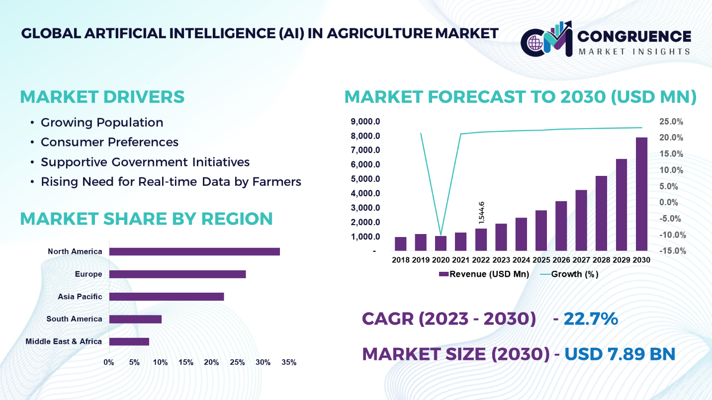 The Global Artificial Intelligence (AI) in Agriculture Market was valued at USD 1,544.6 Million in 2022 and is anticipated to reach a value of USD 7,887.6 Million by 2030 expanding at a CAGR of 22.7% between 2023 and 2030.