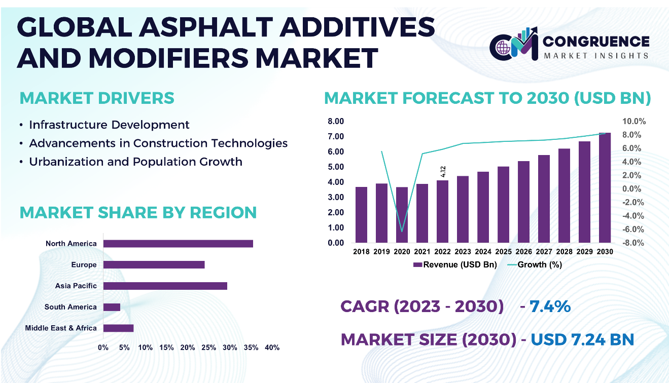 The Global Asphalt Additives and Modifiers market was valued at USD 4.12 Billion in 2022 and is anticipated to reach a value of USD 7.24 Billion by 2030 expanding at a CAGR of 7.4% between 2023 and 2030.