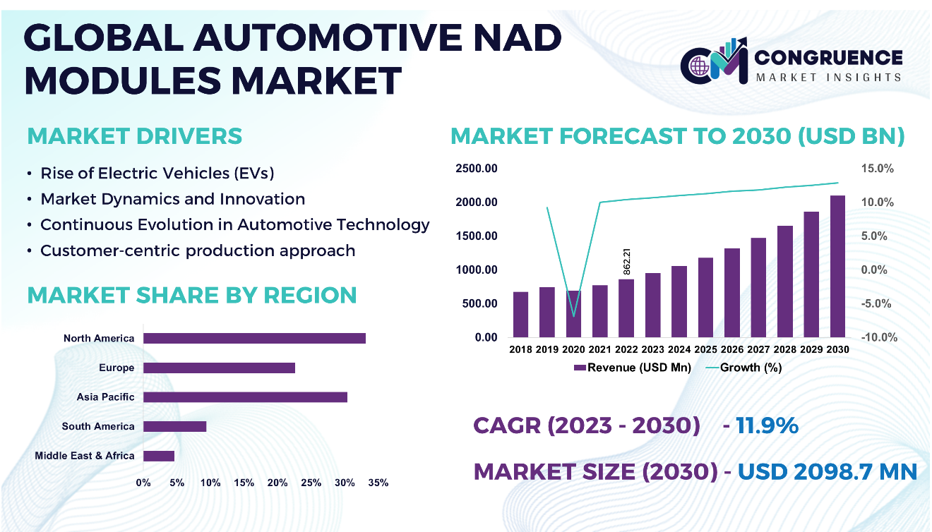 The Global Automotive NAD Modules market was valued at USD 862.2 Million in 2022 and is anticipated to reach USD 2,098.7 Million by 2030 expanding at a CAGR of 11.9% between 2023 and 2030.