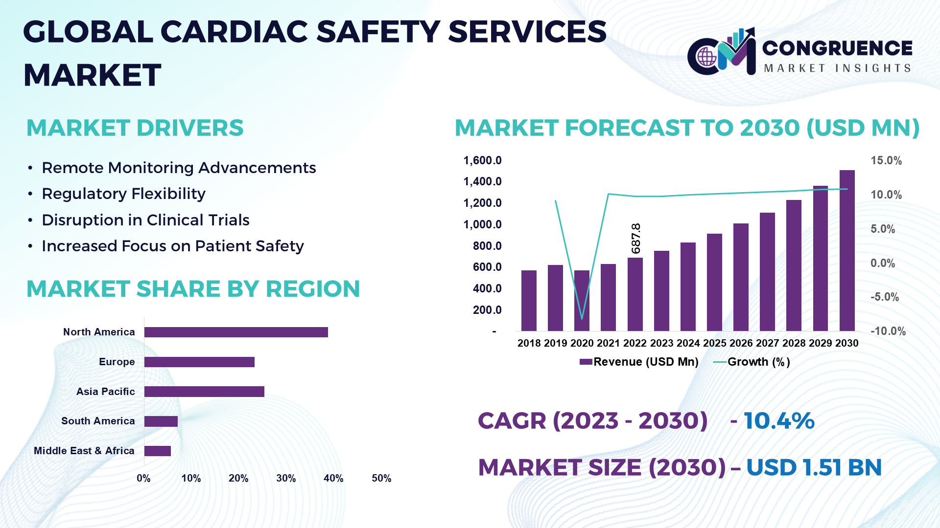 The global cardiac safety services market was valued at USD 687.8 Million in 2022 and is anticipated to reach a value of USD 1,506.8 Million by 2030 expanding at a CAGR of 10.4% between 2023 and 2030.