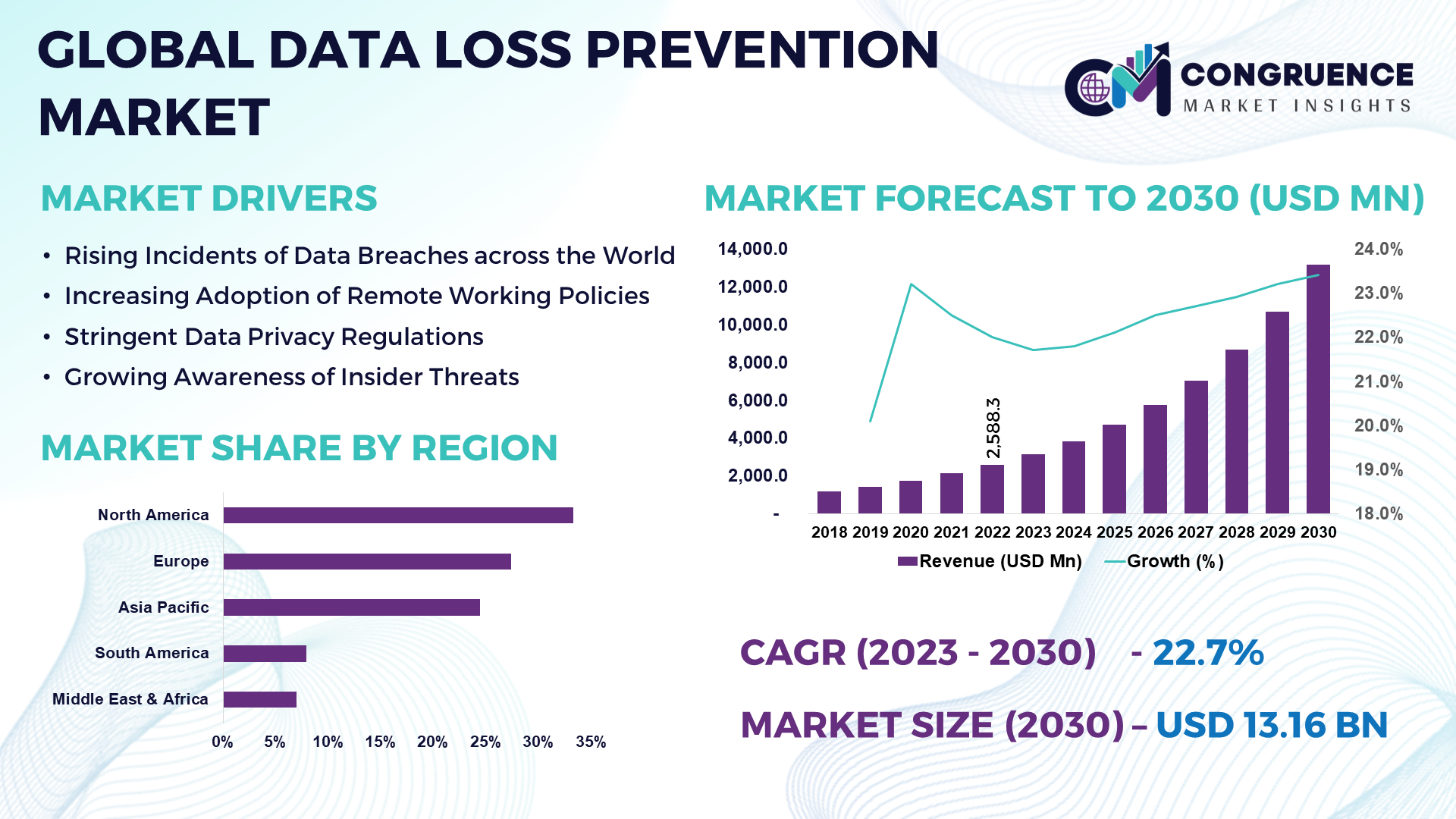 The global data loss prevention market was valued at USD 2,588.3 Million in 2022 and is anticipated to reach a value of USD 13,156.1 Million by 2030 expanding at a CAGR of 22.7% between 2023 and 2030.