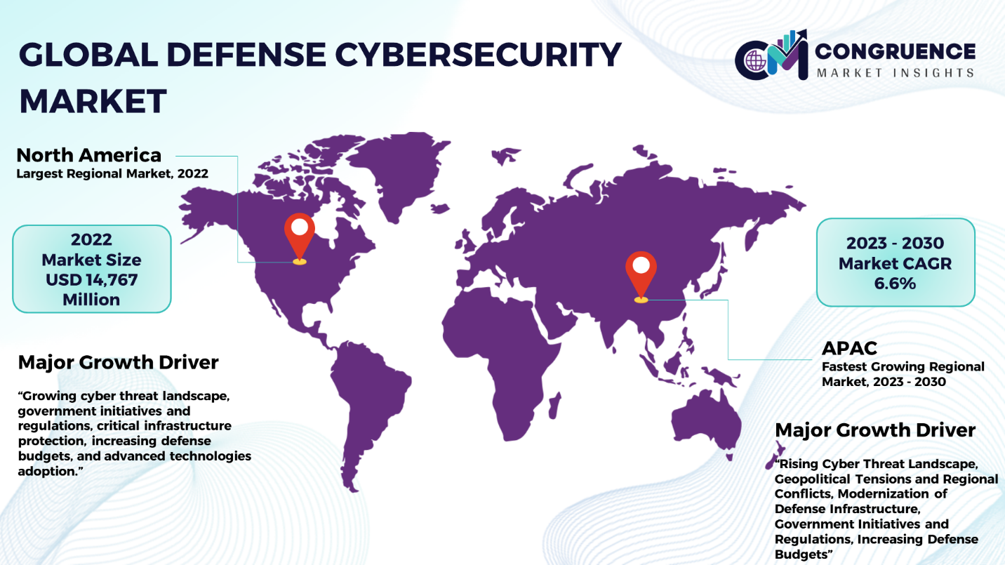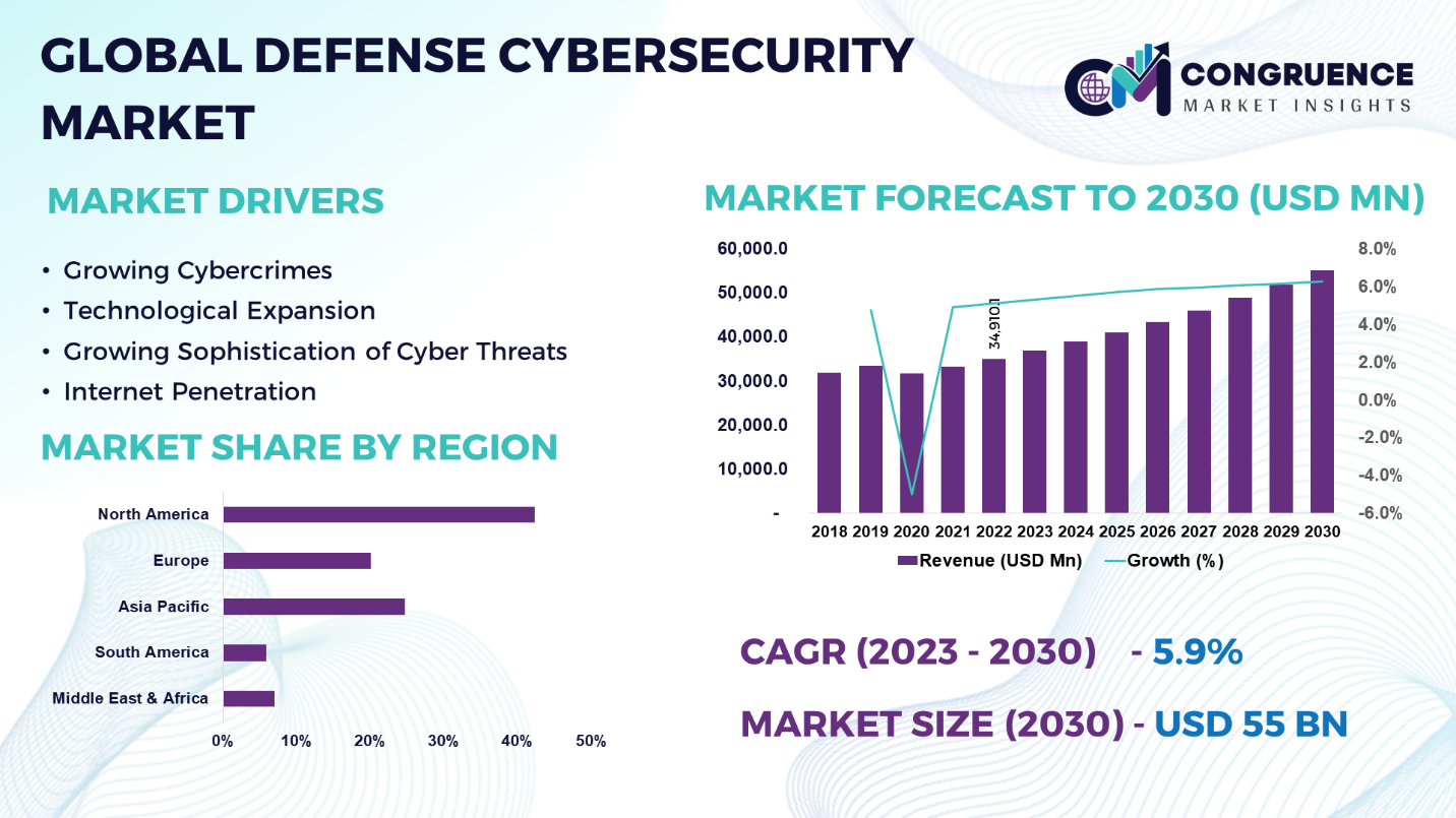 The Global Defense Cybersecurity Market was valued at USD 34,910.1 Million in 2022 and is anticipated to reach a value of USD 54,999.3 Million by 2030 expanding at a CAGR of 5.9% between 2023 and 2030.
