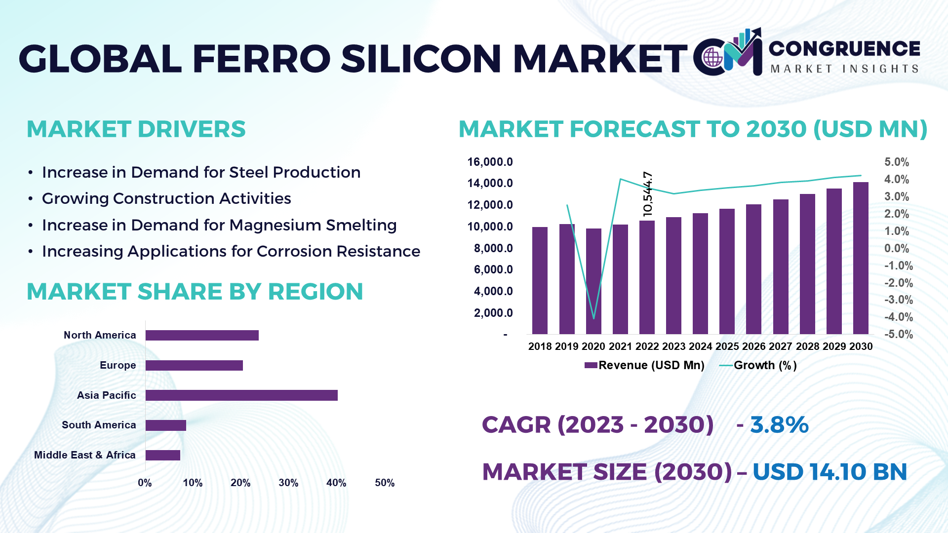 The global ferro silicon market was valued at USD 10,544.7 Million in 2022 and is anticipated to reach a value of USD 14,101.1 Million by 2030 expanding at a CAGR of 3.8% between 2023 and 2030.