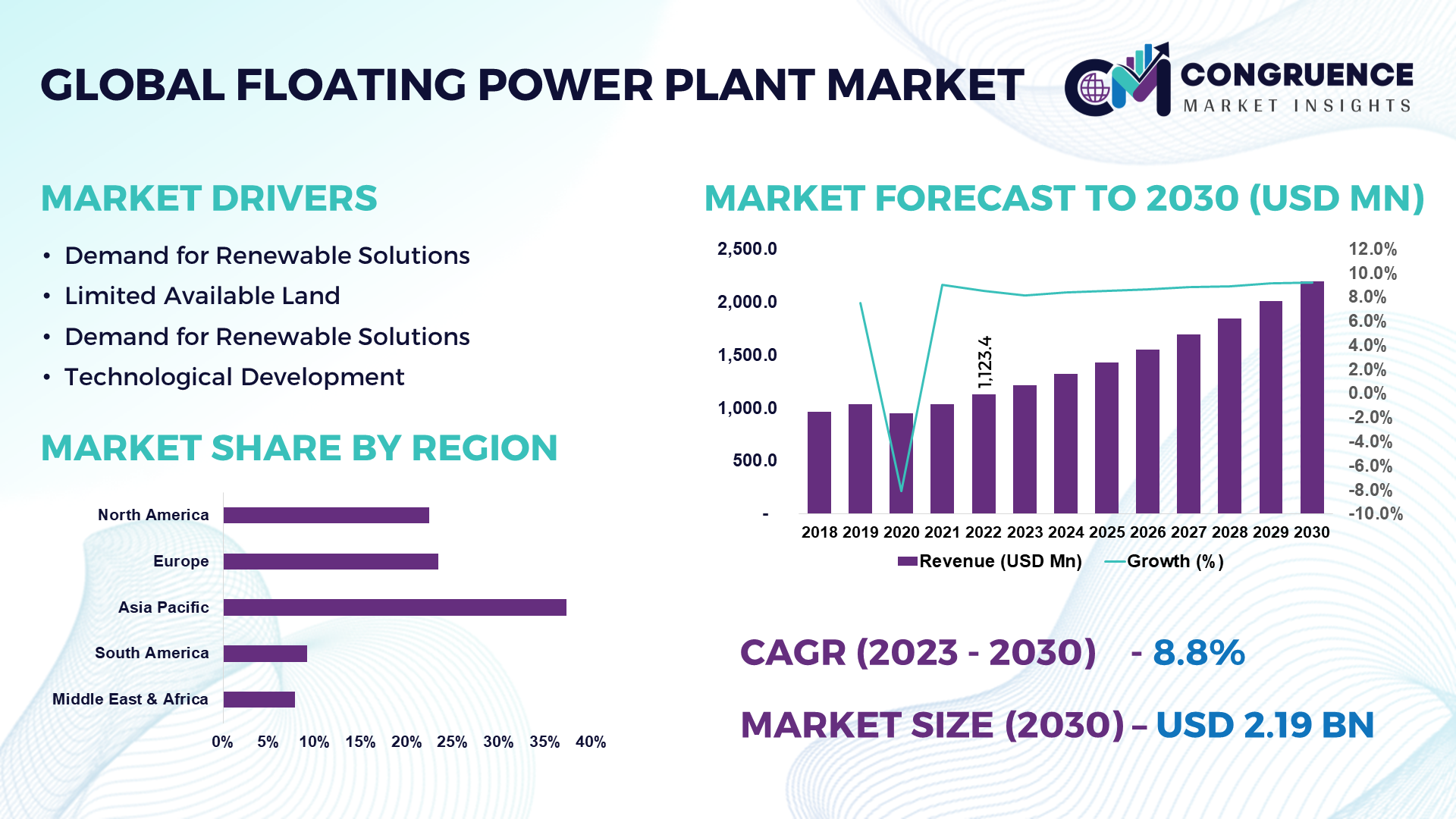 The global floating power plant market was valued at USD 1,123.4 Million in 2022 and is anticipated to reach a value of USD 2,189.6 Million by 2030 expanding at a CAGR of 8.8% between 2023 and 2030.