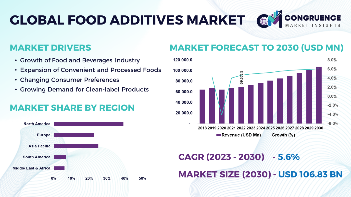 The Global Food Additives Market was valued at USD 69,573.5 Million in 2022 and is anticipated to reach a value of USD 106,830.7 Million by 2030 expanding at a CAGR of 5.6% between 2023 and 2030.