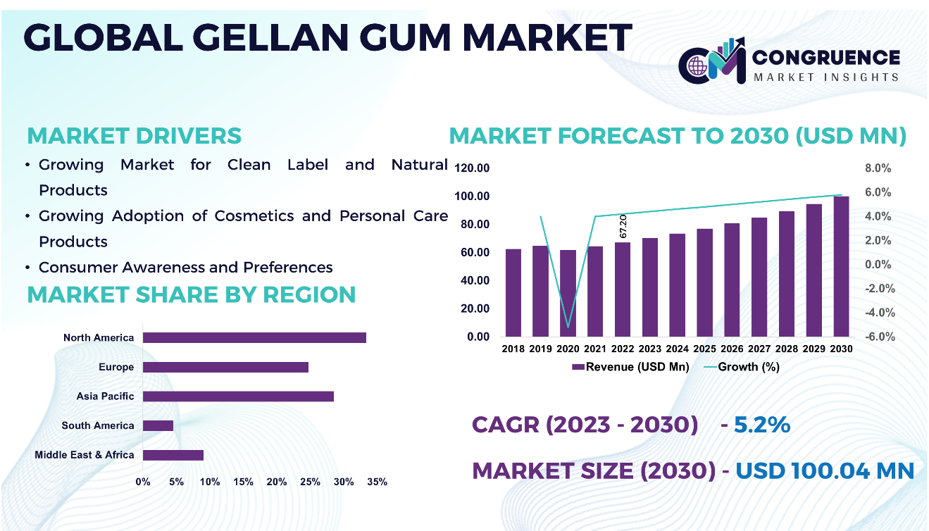 The Global Gellan Gum Market was valued at USD 67.2 Million in 2022 and is anticipated to reach a value of USD 100.04 Million by 2030 expanding at a CAGR of 5.2% between 2023 and 2030.