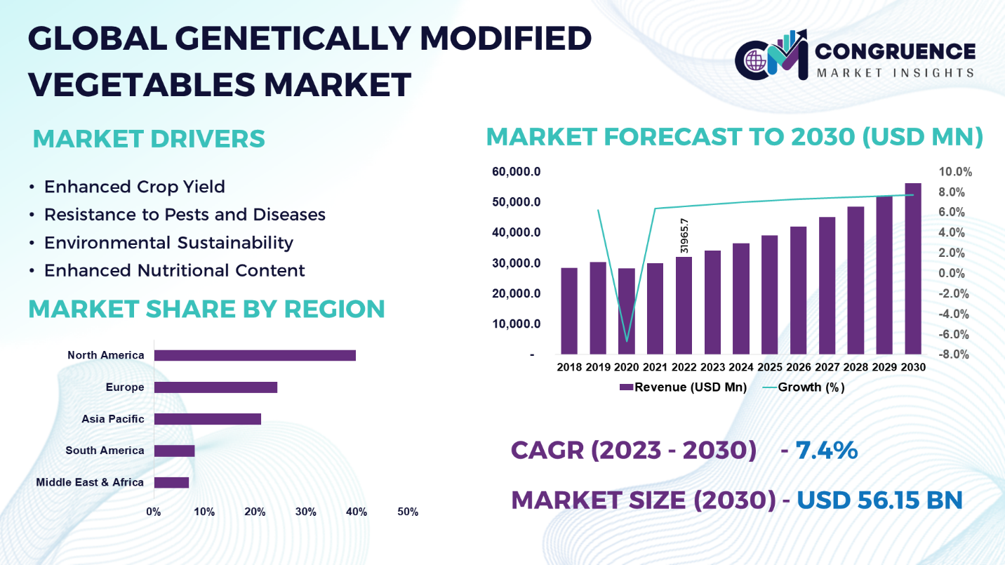 The Global Genetically Modified Vegetables Market was valued at USD 31,965.7 Million in 2022 and is anticipated to reach a value of USD 56,151.7 Million by 2030 expanding at a CAGR of 7.4% between 2023 and 2030.