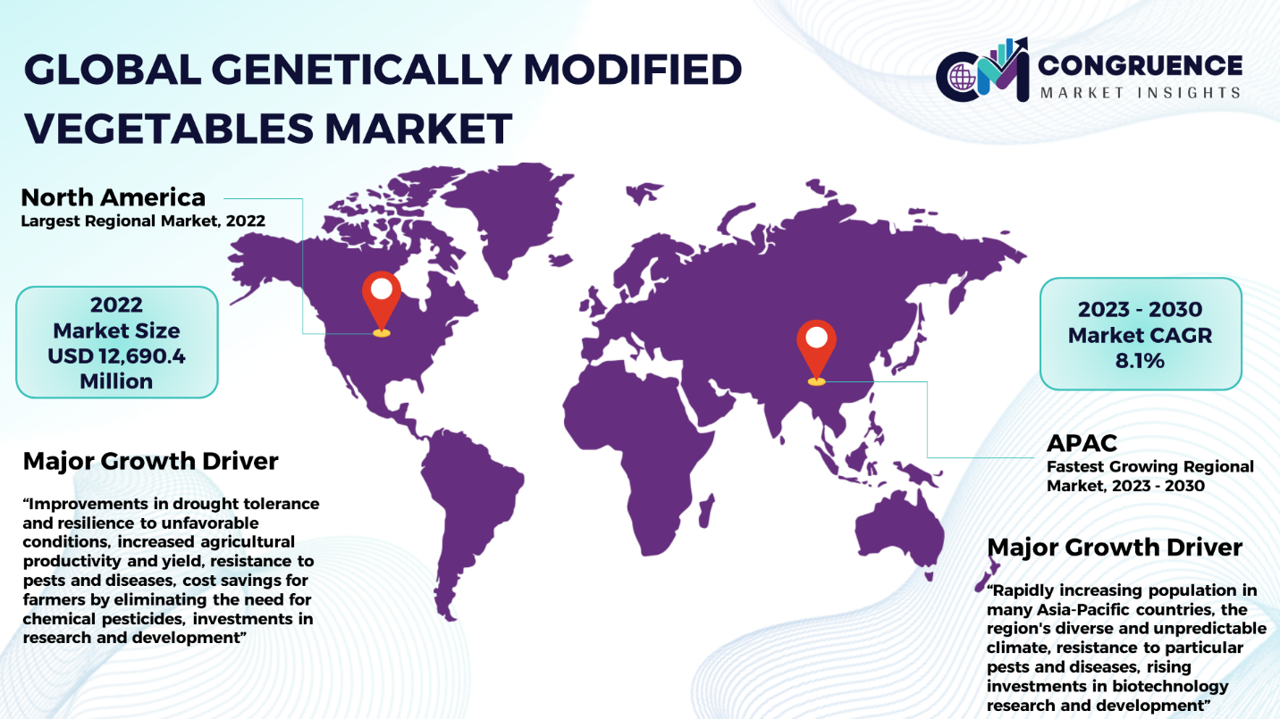 With a market share of 39.7% and a value of USD 12,690.4 million, North America leads the world's genetically modified vegetable industry. Improvements in drought tolerance and resilience to unfavorable conditions, increased agricultural productivity and yield, resistance to pests and diseases, cost savings for farmers by eliminating the need for chemical pesticides, investments in research and development, sustainable agricultural practices, and many other factors are what propel the market in this region. The Asia-Pacific area has shown the fastest development rate in the global market for genetically modified vegetables, with a compound annual growth rate of 8.1%. The region's primary contributors include the rapidly increasing population in many Asia-Pacific countries, the region's diverse and unpredictable climate, which poses challenges to traditional agriculture, resistance to particular pests and diseases, rising investments in biotechnology research and development, genetically modified vegetables (GM) with higher vitamin and mineral content, improved water-use efficiency and tolerance to water stress, and affordable ways to increase productivity, cut losses, and improve overall agricultural sustainability.