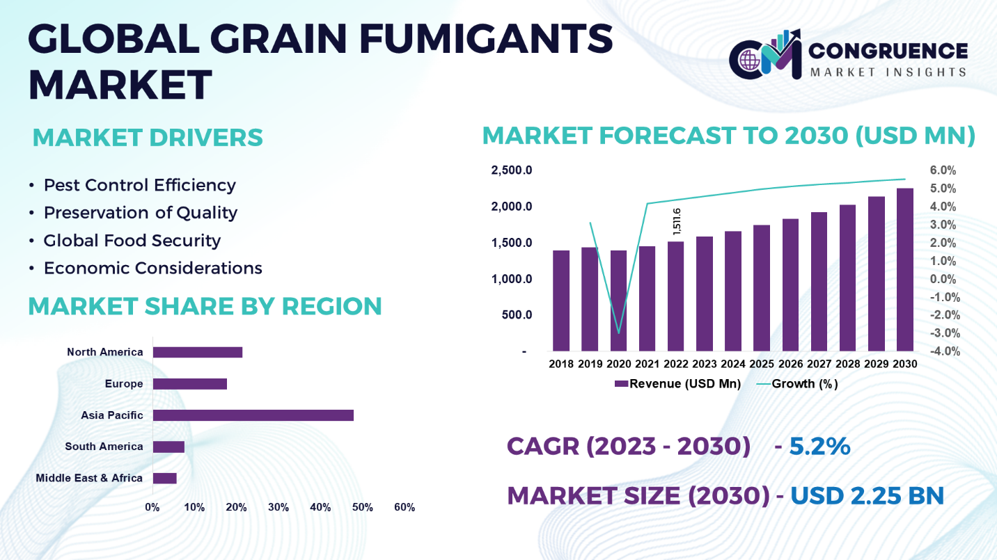 The Global Grain Fumigants Market was valued at USD 1,511.6 Million in 2022 and is anticipated to reach a value of USD 2,249.8 Million by 2030 expanding at a CAGR of 5.2% between 2023 and 2030.