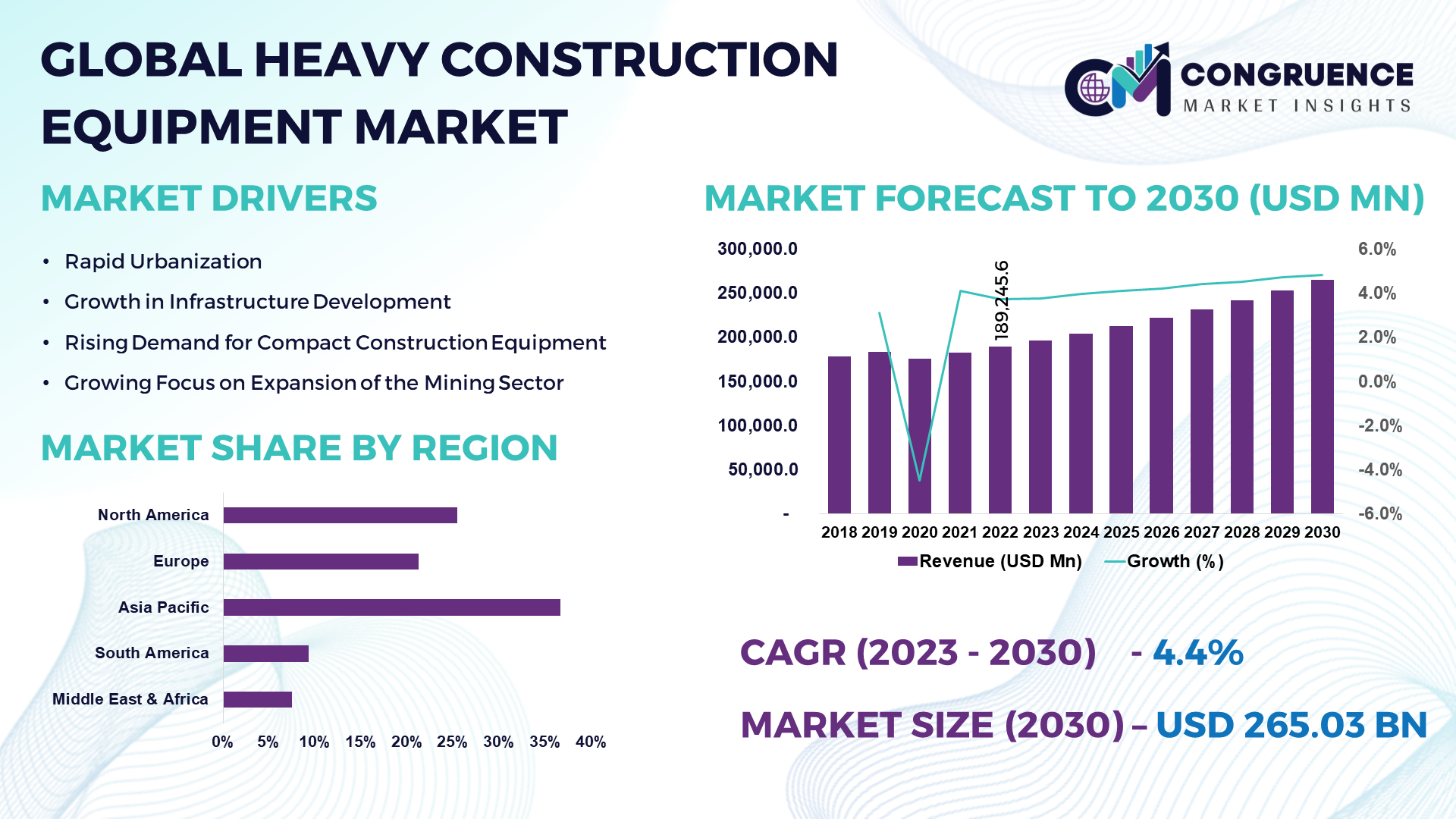 The global heavy construction equipment market was valued at USD 189,245.6 Million in 2022 and is anticipated to reach a value of USD 265,026.9 Million by 2030 expanding at a CAGR of 4.4% between 2023 and 2030.