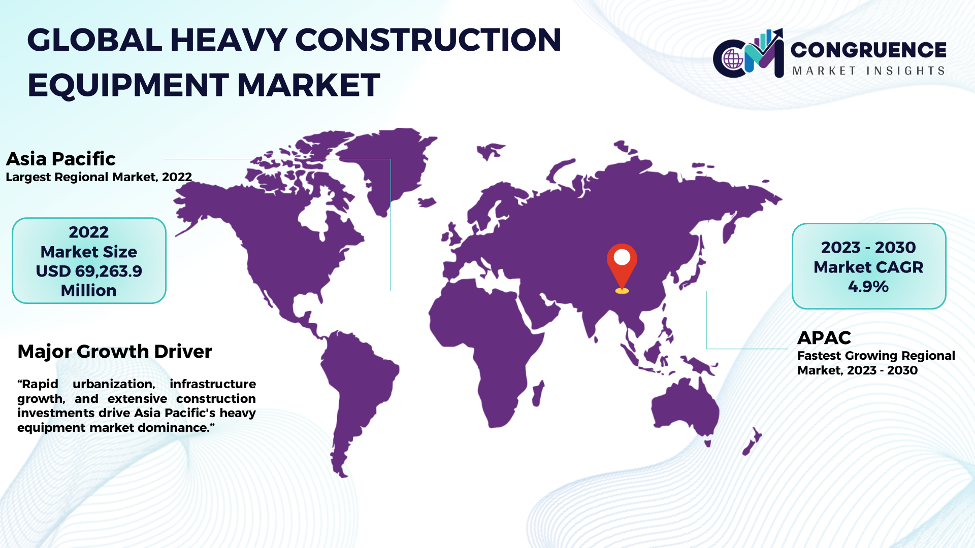 Asia Pacific holds a dominant position in the heavy construction market. The growth in this region is driven by the growing population in major countries such as India and China. Due to rapid urbanization and strong economic growth people seeking higher living standards which creates a strong demand for residential construction projects. Asia Pacific is currently undergoing a rapid urbanization process, witnessing a large population relocating from rural to urban areas which creates a demand for residential and commercial spaces. Europe is the second-largest market for heavy construction equipment. In Europe, the demand is driven by stringent carbon emission regulations. In addition, manufacturers are actively innovating their equipment for more fuel-efficient and improved performance in the region. In North America, the market is characterized by infrastructure development with the mature country of the United States. The increasing demand for automated and sustainable equipment drives the market growth in this region. The Middle East and Africa have been witnessing a significant demand for heavy construction equipment. The demand is driven by increasing construction activities, urbanization and the mining industry.