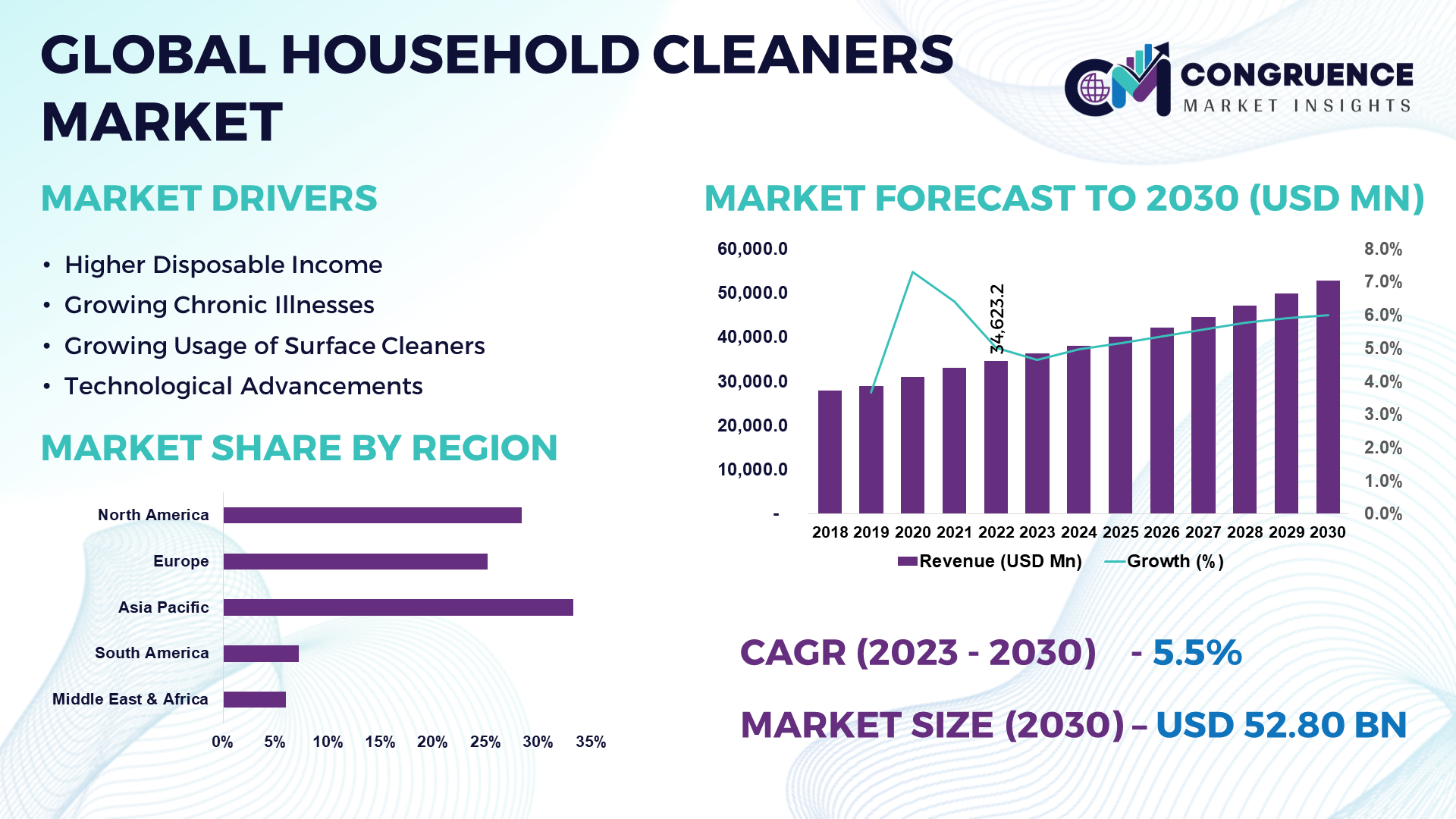 The global household cleaners market was valued at USD 34,623.2 Million in 2022 and is anticipated to reach a value of USD 52,798.9 Million by 2030 expanding at a CAGR of 5.5% between 2023 and 2030.