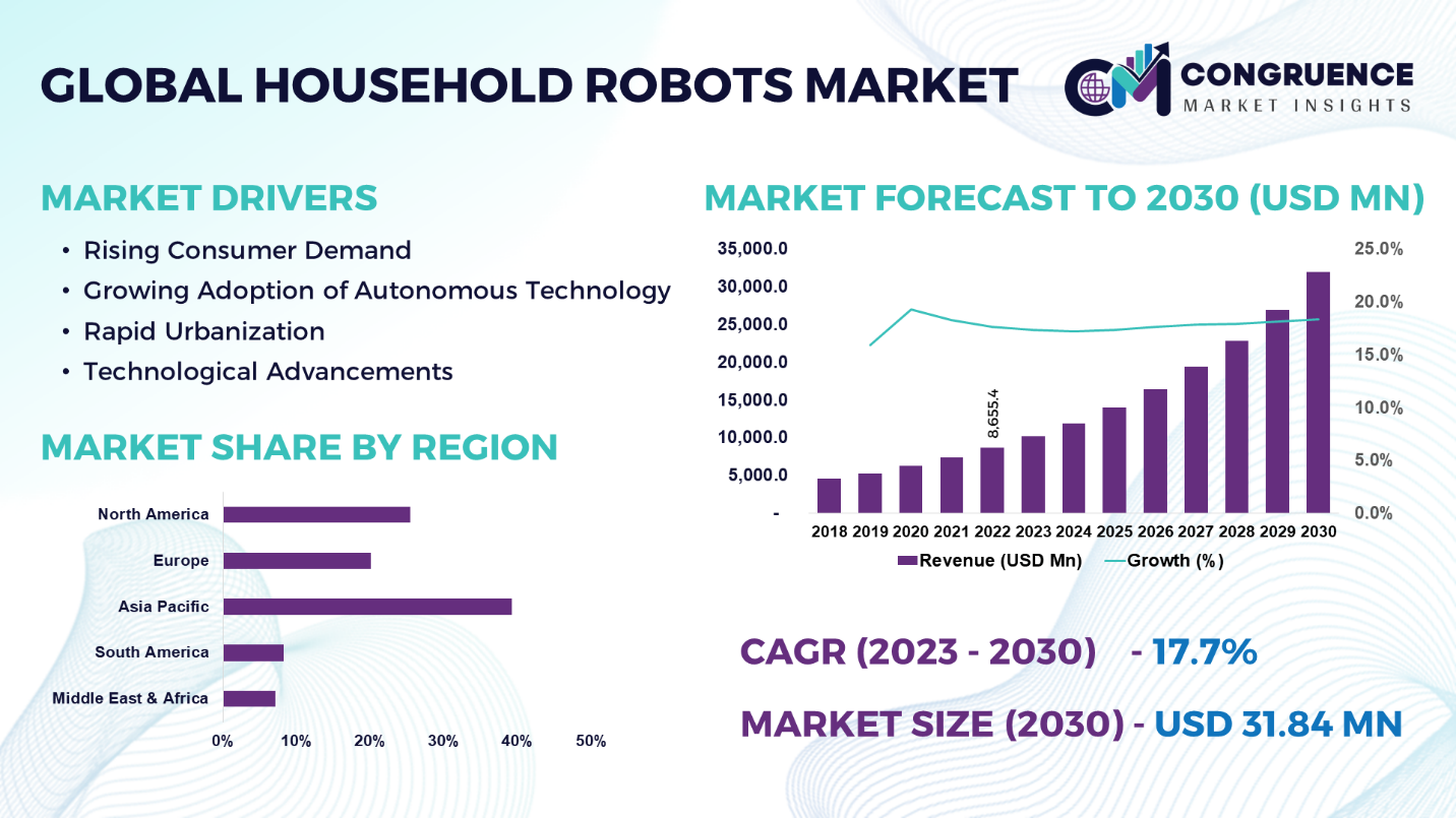 The Global Household Robots Market was valued at USD 8,655.4 Million in 2022 and is anticipated to reach a value of USD 31,839.9 Million by 2030 expanding at a CAGR of 17.7% between 2023 and 2030.