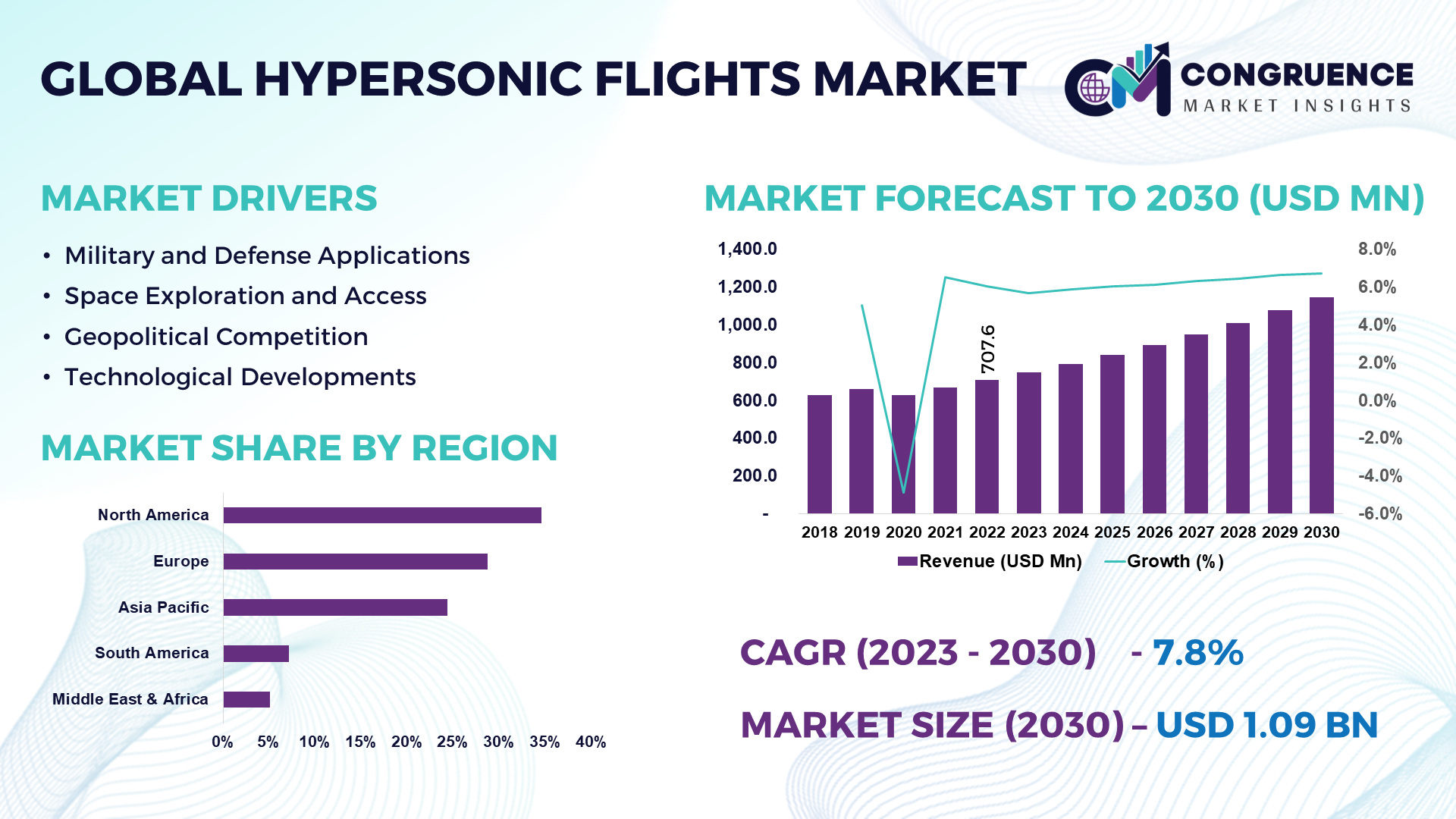 The global hypersonic flight market was valued at USD 707.6 Million in 2022 and is anticipated to reach a value of USD 1,144.9 Million by 2030 expanding at a CAGR of 6.3% between 2023 and 2030.