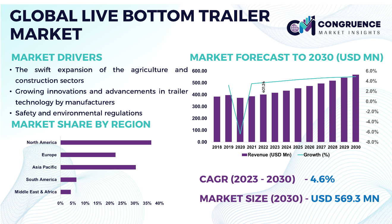 The Global Live Bottom Trailer Market was valued at USD 401.2 Million in 2022 and is anticipated to reach a value of USD 569.3 Million by 2030 expanding at a CAGR of 4.6% between 2023 and 2030.