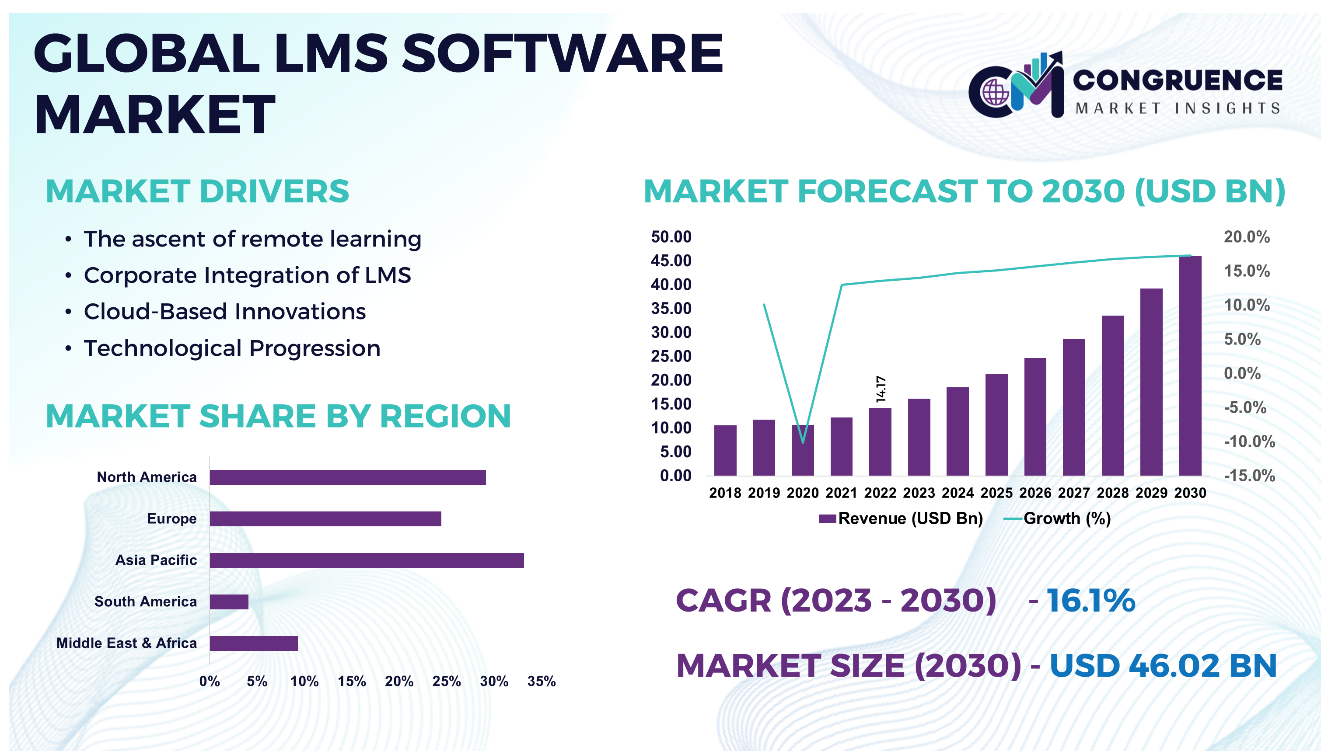 The Global LMS Software Market was valued at USD 14.17 Bn in 2022 and is anticipated to reach a value of USD 46.02 Bn by 2030 expanding at a CAGR of 16.1% between 2023 and 2030.