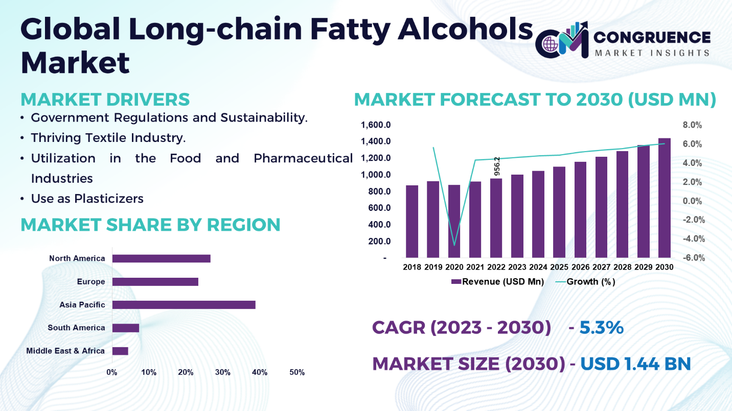 The Global Long-Chain Fatty Alcohols Market was valued at USD 956.2 Million in 2022 and is anticipated to reach a value of USD 1,438.2 Million by 2030 expanding at a CAGR of 5.3% between 2023 and 2030.