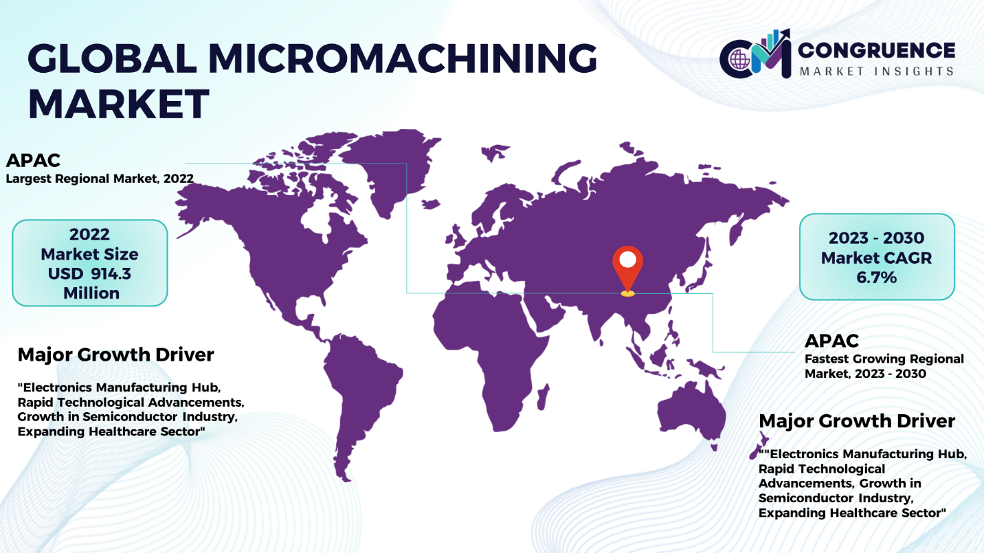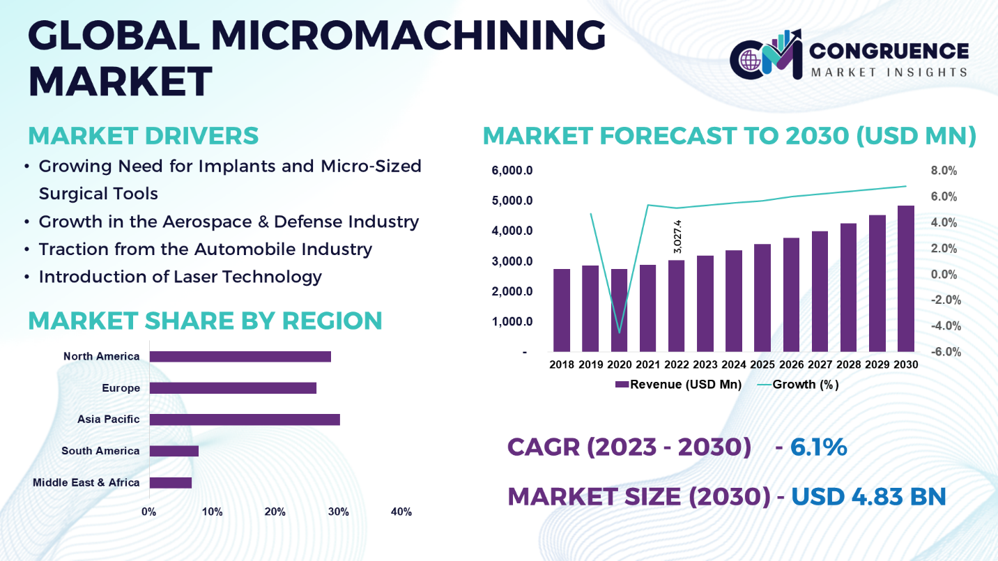 The global micromachining market was valued at USD 3,027.4 Million in 2022 and is anticipated to reach a value of USD 4,834.2 Million by 2030 expanding at a CAGR of 6.1% between 2023 and 2030.