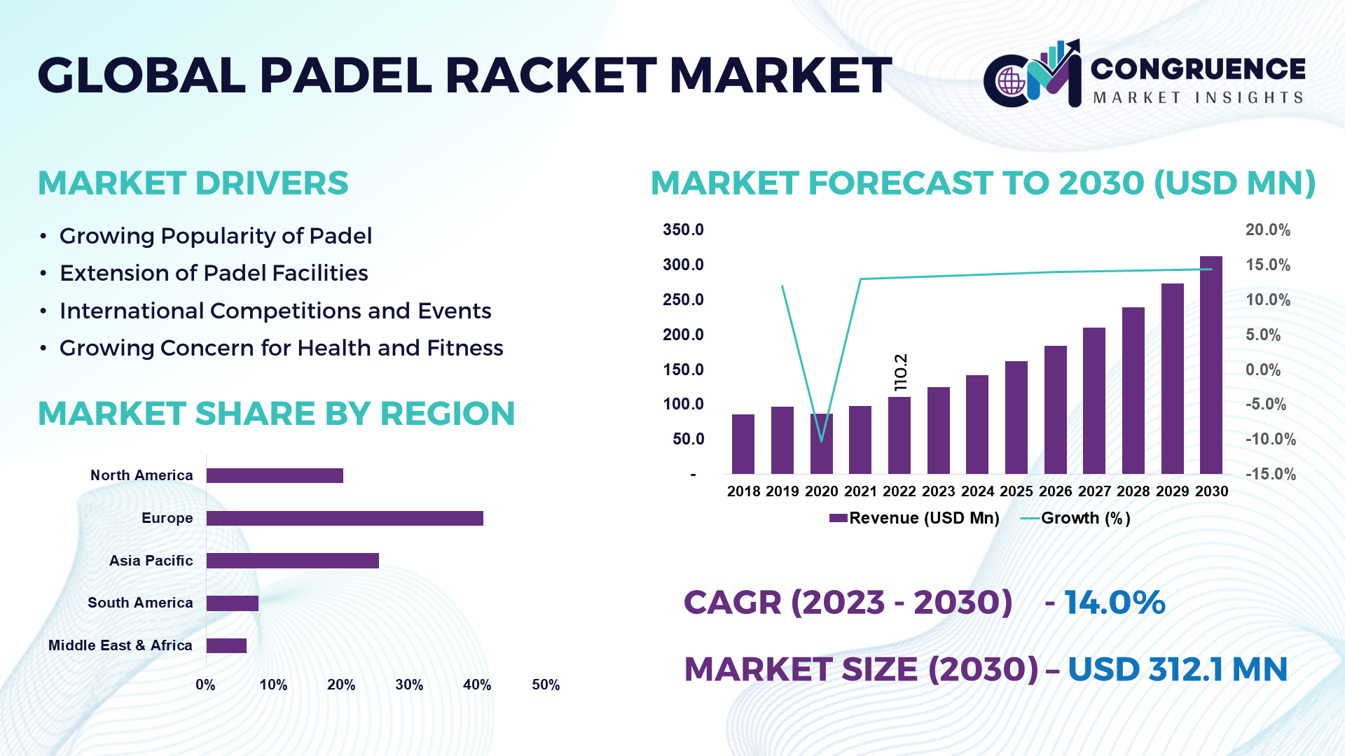 The Global Padel Racket Market was valued at USD 110.2 Million in 2022 and is anticipated to reach a value of USD 312.1 Million by 2030 expanding at a CAGR of 14.0% between 2023 and 2030.
