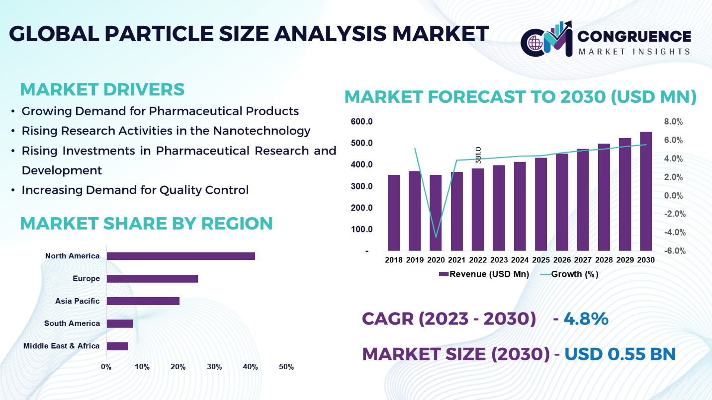 The Global Particle Size Analysis Market was valued at USD 381.0 Million in 2022 and is anticipated to reach a value of USD 551.6 Million by 2030 expanding at a CAGR of 4.8% between 2023 and 2030.