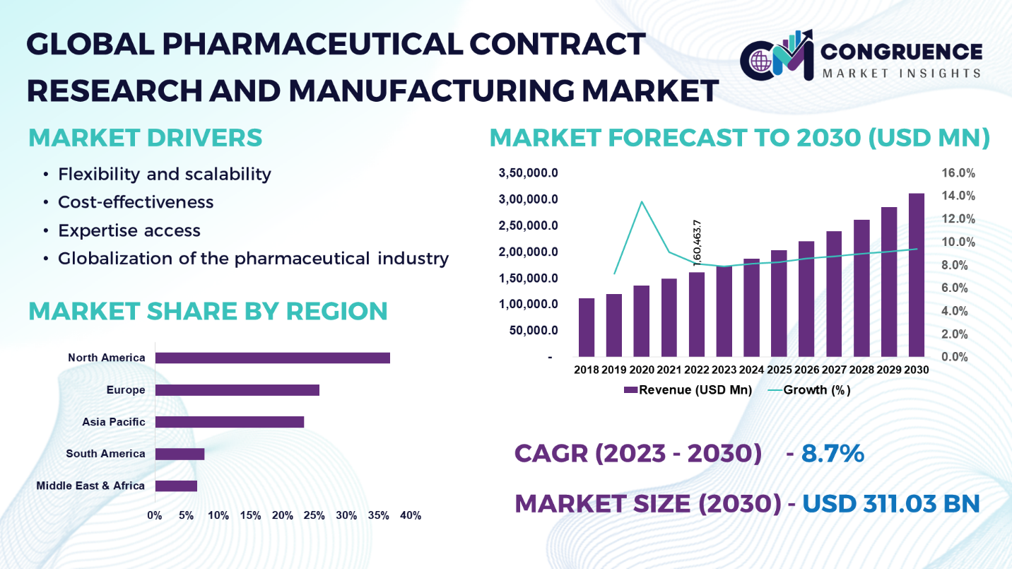 The global pharmaceutical contract research and manufacturing market was valued at USD 160,463.7 Million in 2022 and is anticipated to reach a value of USD 311,034.9 Million by 2030 expanding at a CAGR of 8.7% between 2023 and 2030.