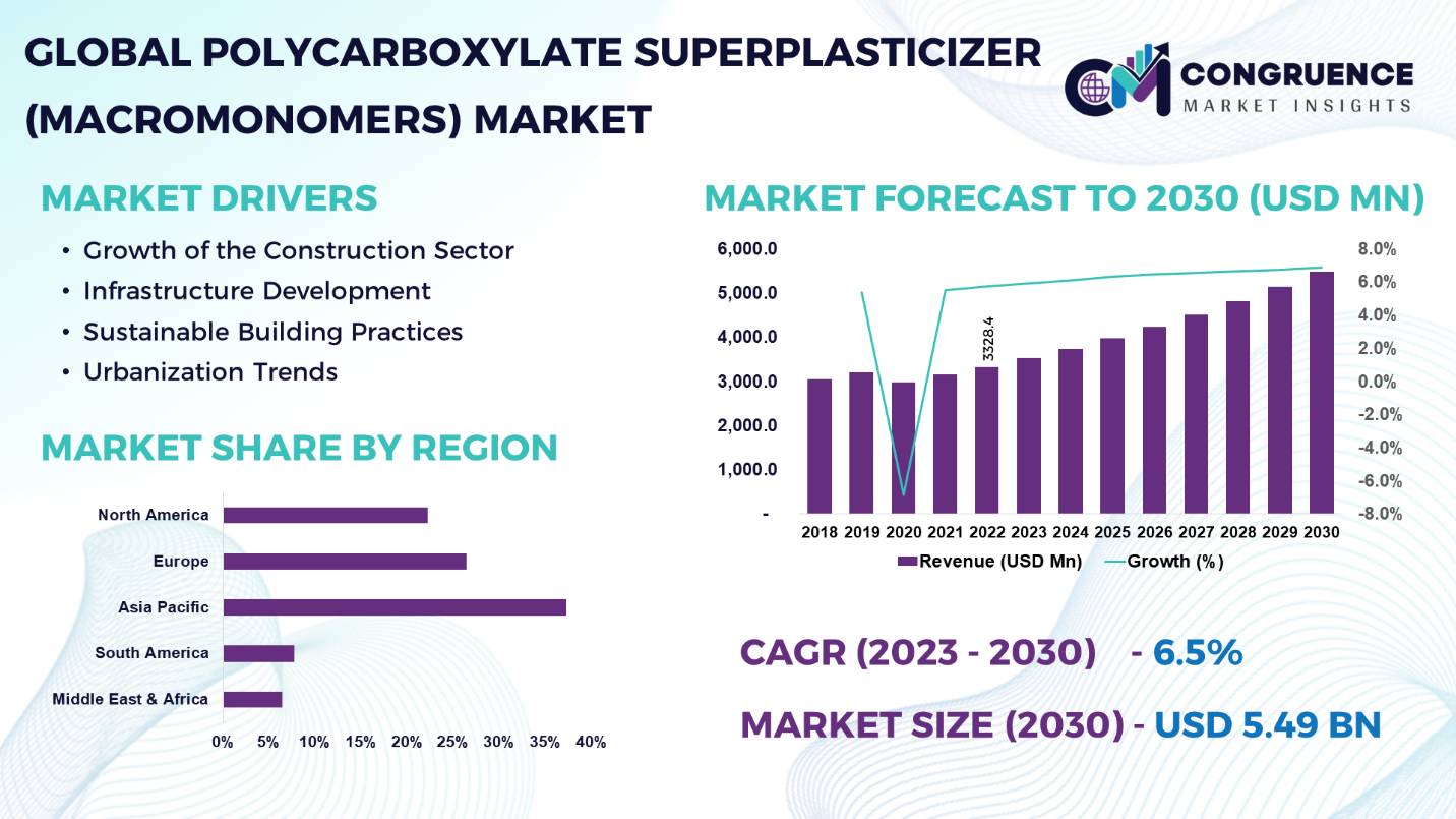 The Global Polycarboxylate Superplasticizer (Macromonomers) market was valued at USD 3,328.4 Million in 2022 and is anticipated to reach a value of USD 5,486.3 Million by 2030 expanding at a CAGR of 6.5% between 2023 and 2030.