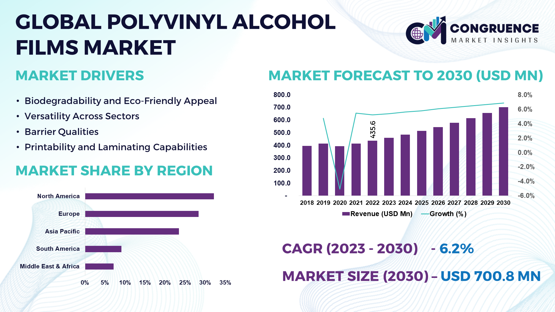 The global polyvinyl alcohol films market was valued at USD 435.6 Million in 2022 and is anticipated to reach a value of USD 700.8 Million by 2030 expanding at a CAGR of 6.2% between 2023 and 2030.