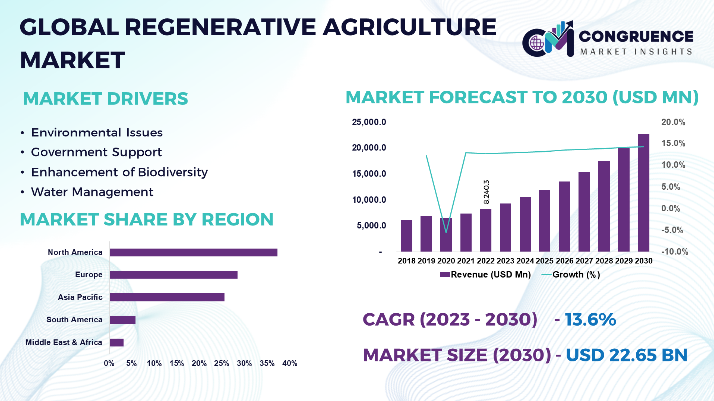 The global regenerative agriculture market was valued at USD 8,240.3 Million in 2022 and is anticipated to reach a value of USD 22,653.8 Million by 2030 expanding at a CAGR of 13.6% between 2023 and 2030.