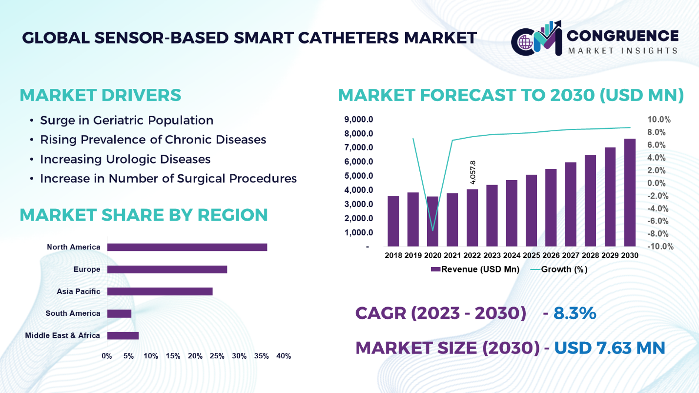 The Global Sensor-based Smart Catheters Market was valued at USD 4,057.8 Million in 2022 and is anticipated to reach a value of USD 7,626.7 Million by 2030 expanding at a CAGR of 8.3% between 2023 and 2030.