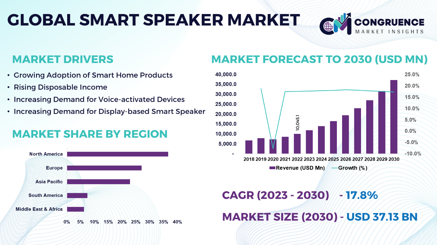 The Global Smart Speaker Market was valued at USD 10,045.1 Million in 2022 and is anticipated to reach a value of USD 37,130.8 Million by 2030 expanding at a CAGR of 17.8% between 2023 and 2030.