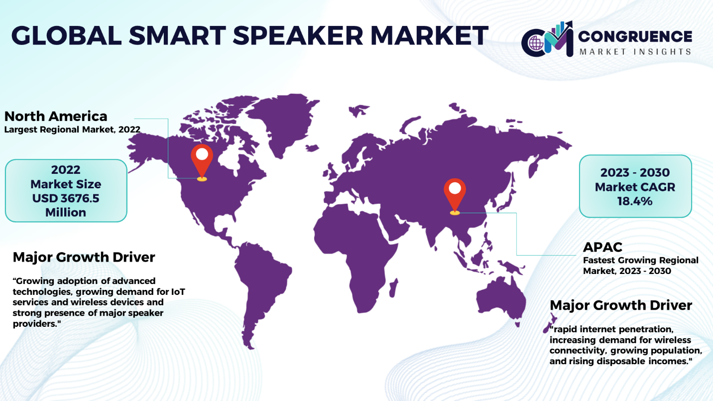 In North America, the demand is driven by growing adoption of advanced technologies, growing demand for IoT services and wireless devices, large number of smart homes, smart offices, and strong presence of major speaker providers. Furthermore, North America has been highly responsive to the technological advancements to improve their client-centric approaches. Europe has significant demand for smart speakers owing to development of digital technologies in the region. In addition, the growth is attributed to factors such as growing adoption of smart homes, increasing demand for voice-activated devices, and increasing funding in research and development activities in the region. In Asia-Pacific, the smart speaker market is growing rapidly and is expected to witness a significant growth in forecast period. In Asia Pacific, the market is characterized by rapid internet penetration, increasing demand for wireless connectivity, adoption of innovative technologies, growing population, and rising disposable incomes which has created an increasing demand for smart speakers. The Middle East and Africa has been witnessing a growing demand for smart speaker. The market is influenced by economic factors, increasing disposable income, increasing adoption of smart devices, and rising prevalence of smart speaker in the region.