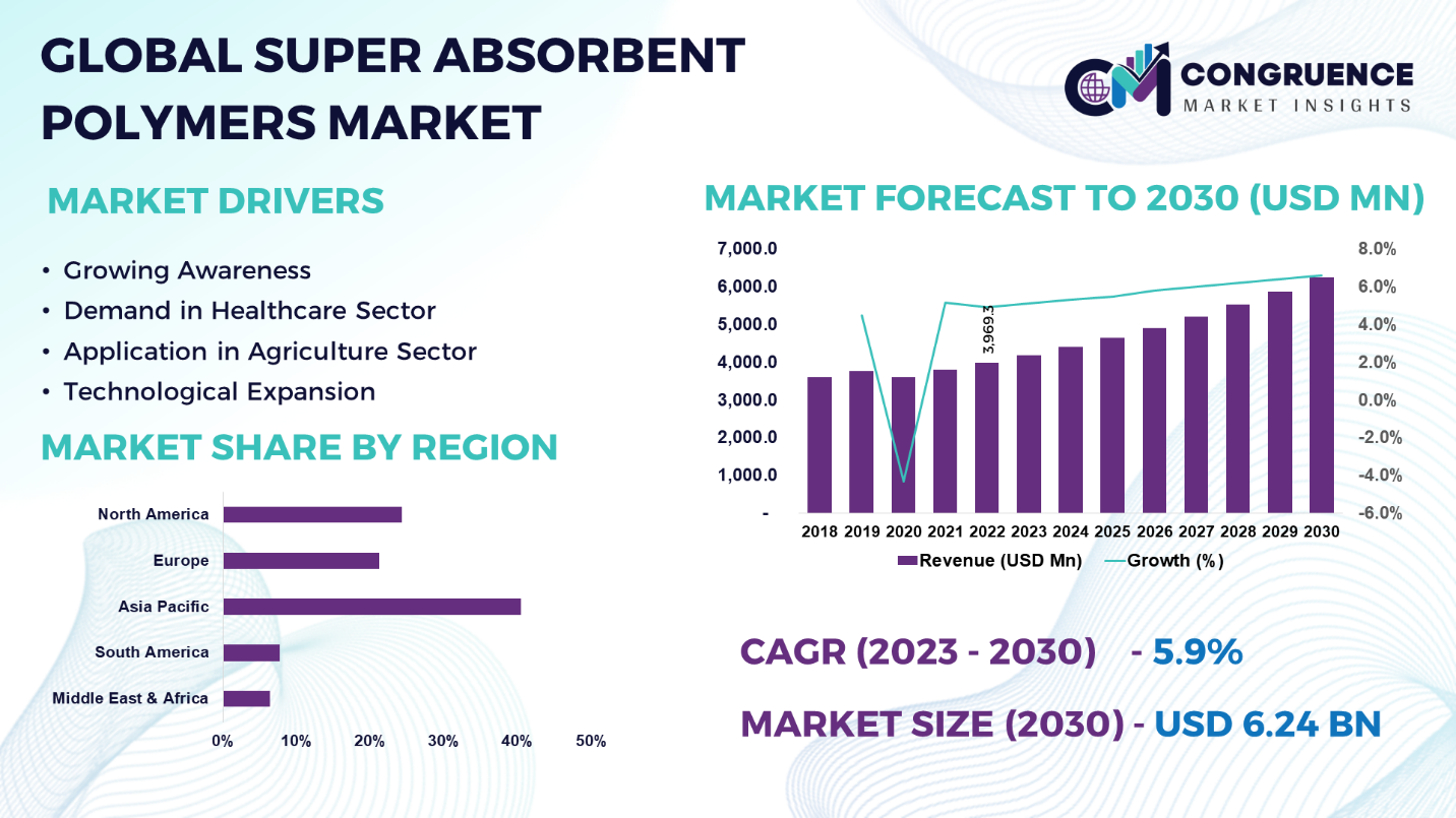 The Global Super Absorbent Polymers Market was valued at USD 3,969.3 Million in 2022 and is anticipated to reach a value of USD 6,243.3 Million by 2030 expanding at a CAGR of 5.9% between 2023 and 2030.
